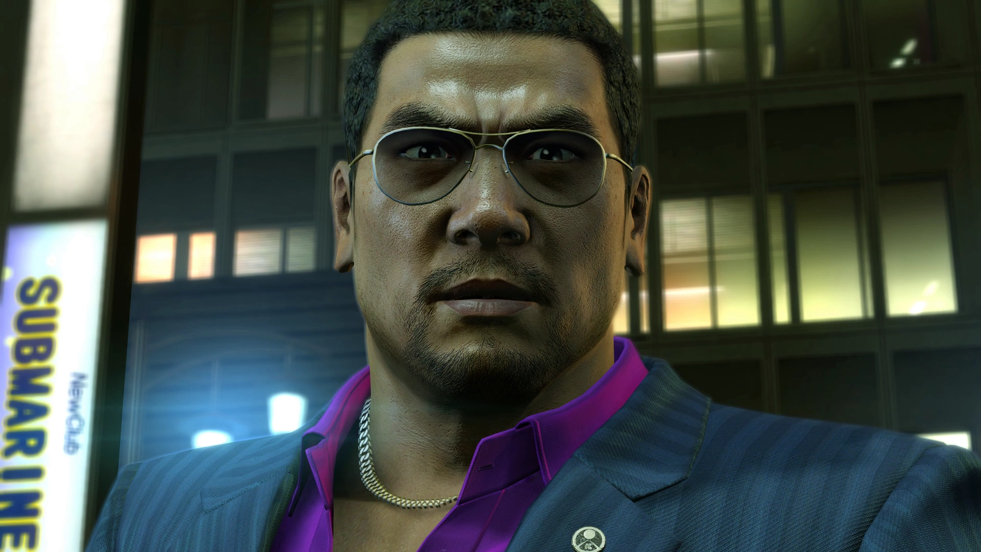 Matsushige wears a navy pinstriped suit over magenta shirt and a pair of aviator sunglasses.